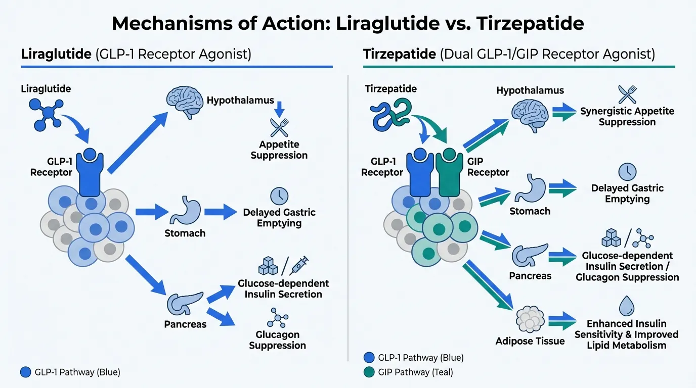Liraglutide vs Tirzepatide: Daily Single Agonist vs Weekly Dual Agonist