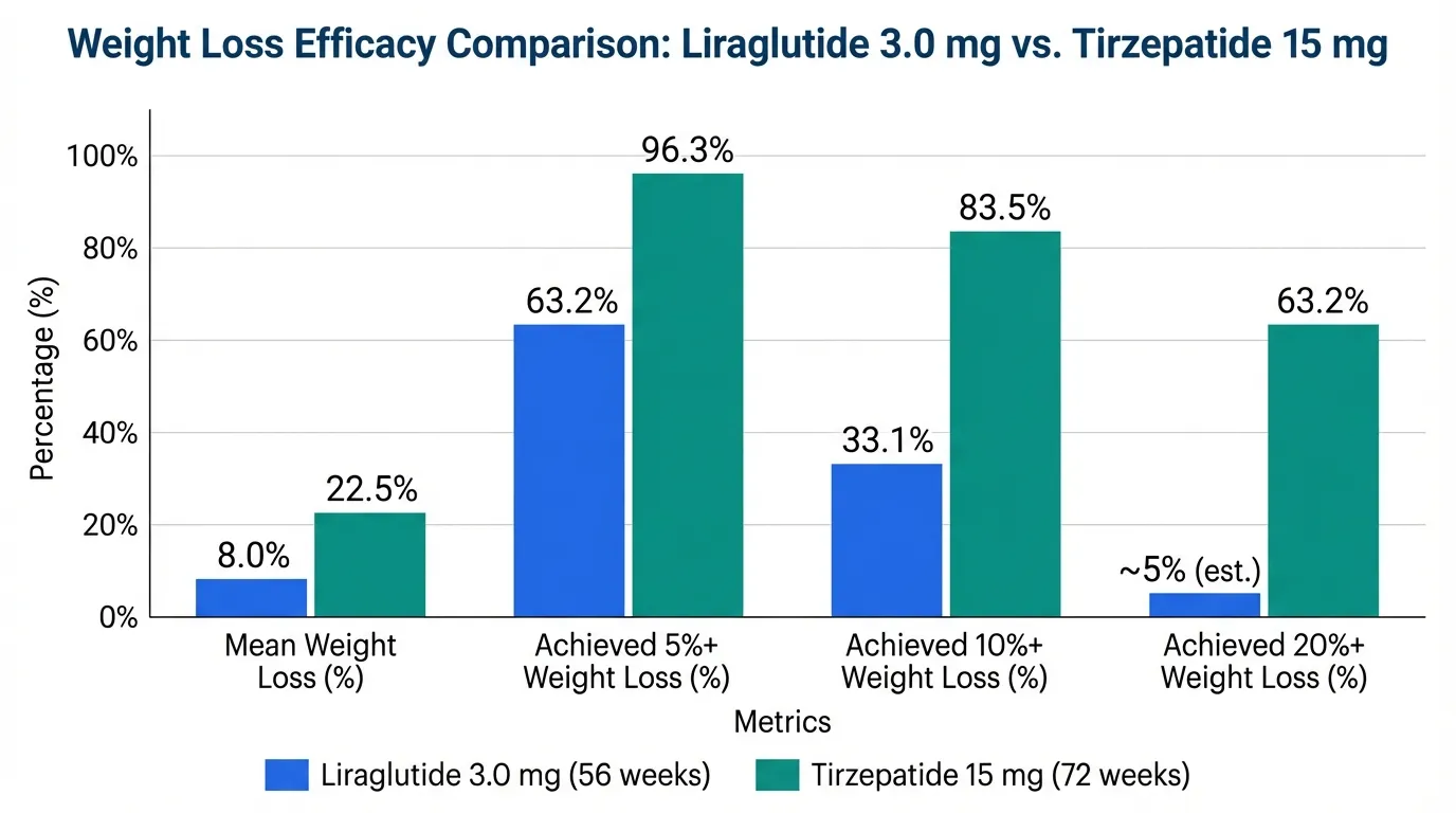| Metric | Liraglutide 3.0 mg | Tirzepatide 15 mg |