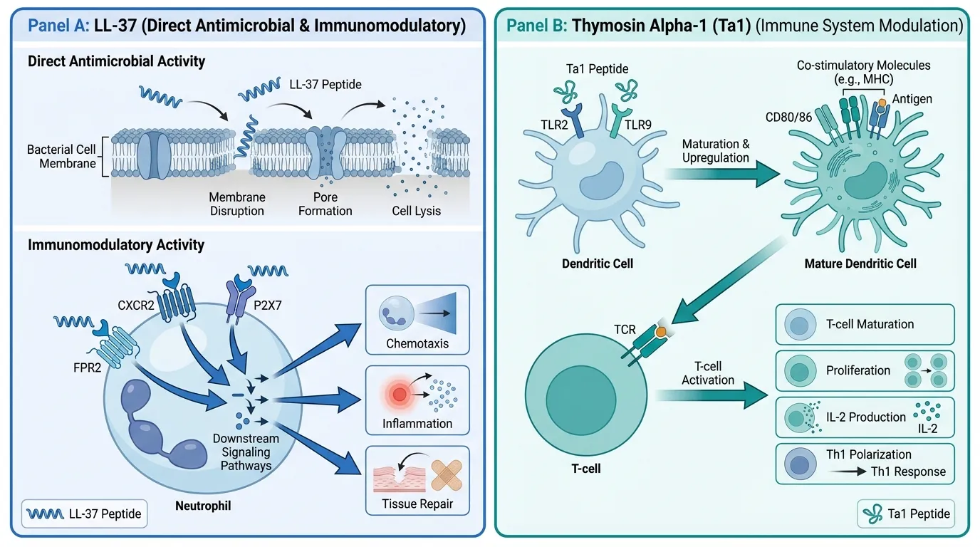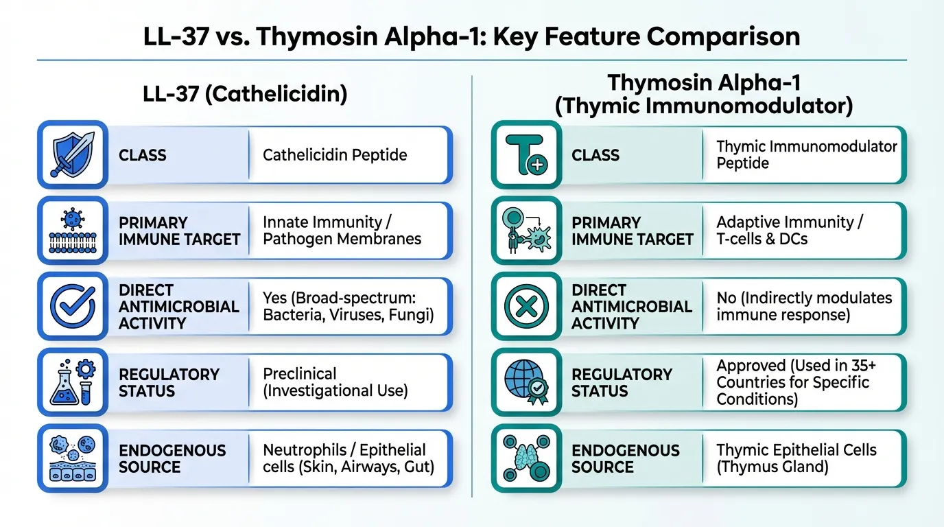 LL-37 vs Thymosin Alpha-1 as immune peptides compared — antimicrobial mechanisms, T-cell modulation, and clinical research evidence.