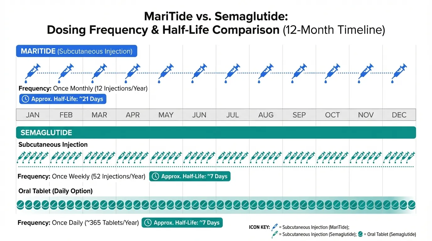 MariTide's once-monthly dosing (12 injections per year) represents a major convenience advantage over semaglutide's weekly schedule (52 injections per year). This could significantly improve adherence.