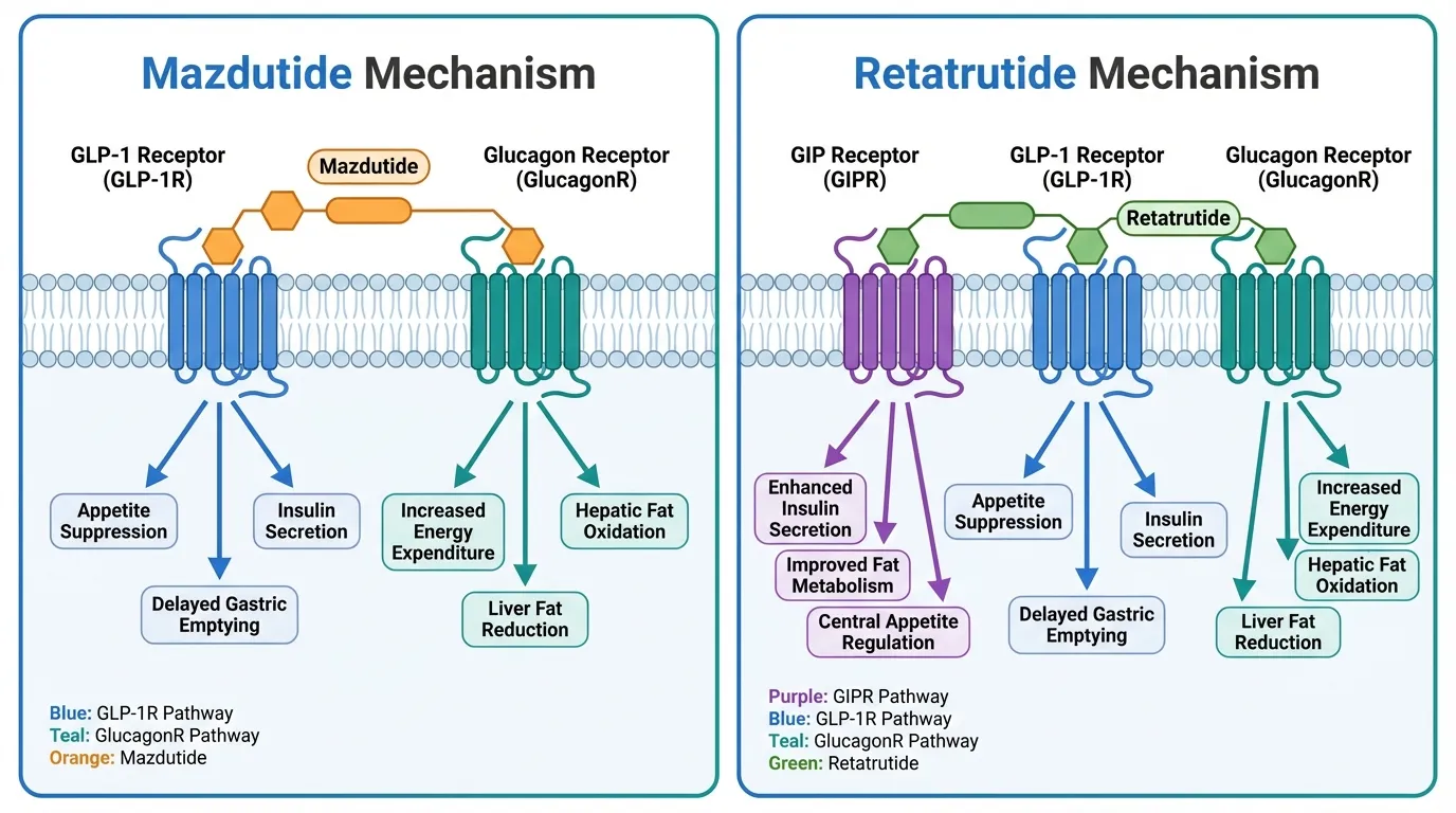 Mazdutide and retatrutide are both multi-receptor agonists that go beyond single-target GLP-1 therapy for obesity and diabetes. They share glucagon receptor agonism as a key differentiator from pure GLP-1 drugs like semaglutide, but differ in the number of receptor targets and their clinical development trajectories.