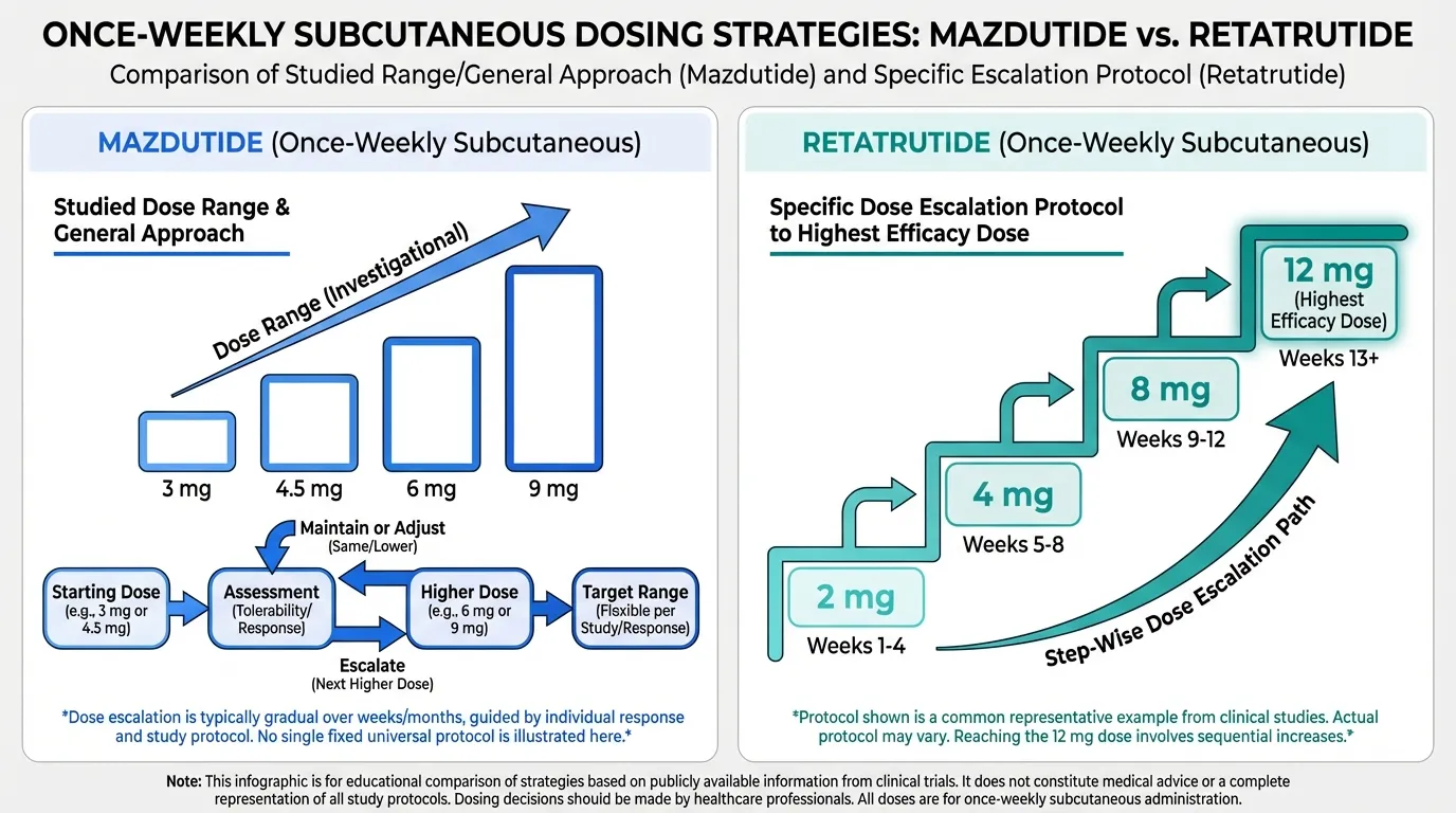 Mazdutide has been studied at 3 mg, 4.5 mg, 6 mg, and 9 mg once-weekly doses across Phase 3 trials. GLORY-1 tested 4 mg and 6 mg over 48 weeks, while GLORY-2 tested 9 mg over 60 weeks. Dose escalation protocols are used with stepwise increases.