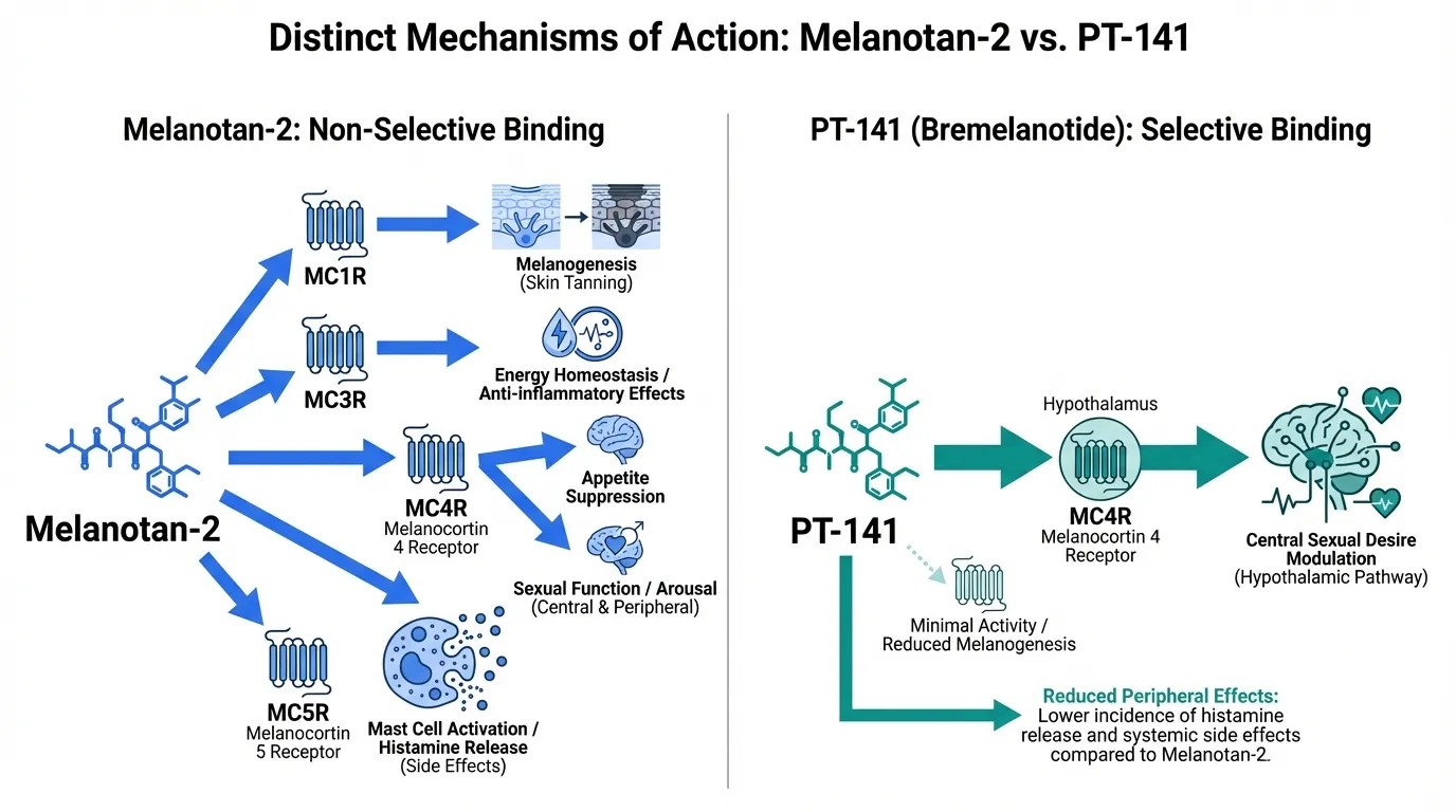 | Mechanism of Action | Non-selective melanocortin agonist activating MC1R (tanning), MC3R/MC4R (appetite, sexual function), and MC5R; also triggers mast cell histamine release as an off-target mechanism | Cyclic heptapeptide derived from MT-2 with primary activity at MC4R in the hypothalamus for sexual desire; retains some MC1R activity but optimized for central nervous system sexual function effects | Comparable |