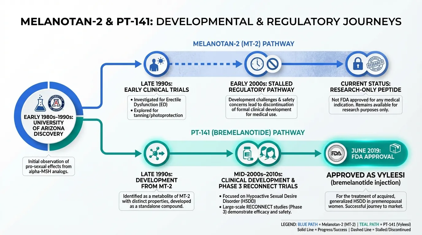 The relationship between these peptides illustrates the drug development process: MT-2 was the discovery compound, PT-141 was the optimized derivative, and only PT-141 completed the journey to approval. For a comparison of different tanning peptides, see our Melanotan-1 vs Melanotan-2 article, or explore gonadorelin for another perspective on reproductive peptides. Use the half-life comparison tool to compare dosing frequencies across melanocortin peptides.