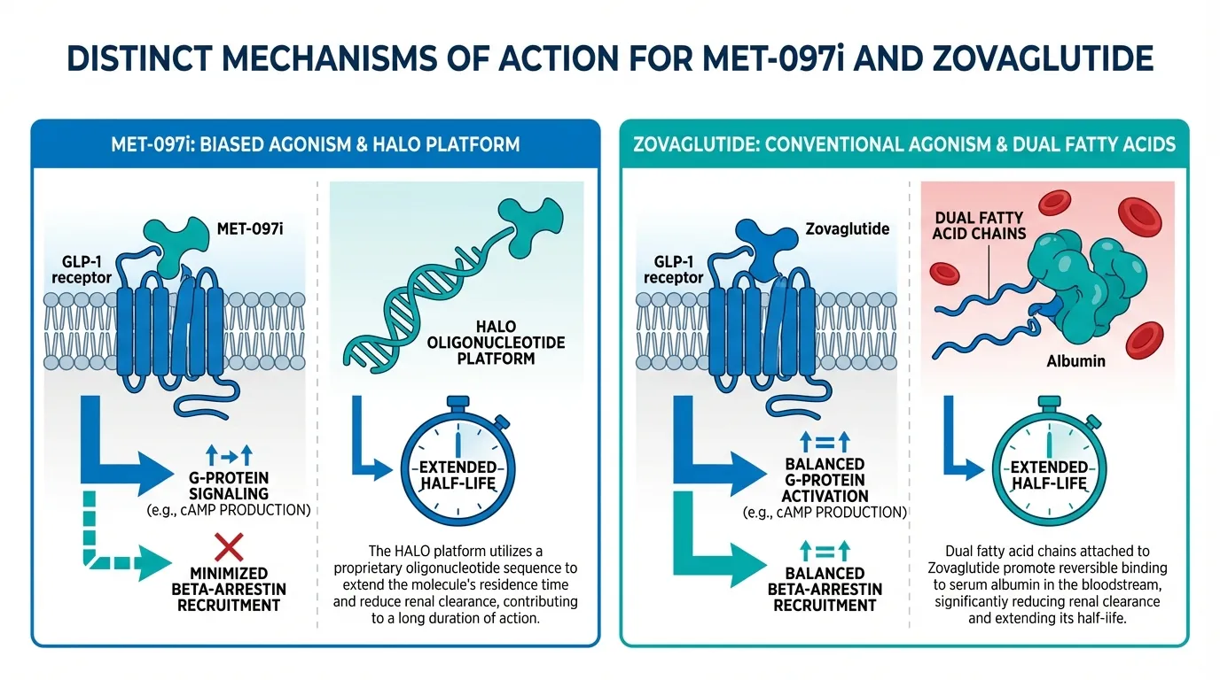 The race to develop the first once-monthly GLP-1 agonist features two promising competitors with distinct approaches. MET-097i brings a novel biased agonist mechanism (HALO platform), an ultra-long 380-hour half-life, and the substantial development resources of Pfizer's approximately $10 billion acquisition. Zovaglutide offers a dual fatty acid chain design, true once-monthly dosing from initiation (rather than transition from weekly), and an exceptionally low 1.3% GI discontinuation rate in Phase 2.