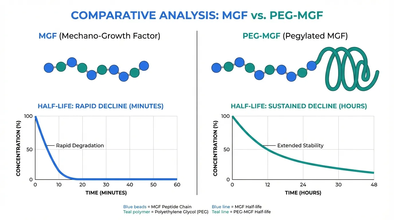 | Pharmacokinetics | Half-life approximately 5-7 minutes; rapidly cleared from circulation; acts as a local paracrine/autocrine factor; requires frequent dosing for sustained effect | Half-life extended to several hours via PEGylation; systemic distribution possible; reduced proteolytic degradation and renal clearance; less frequent dosing needed | PEG-MGF |