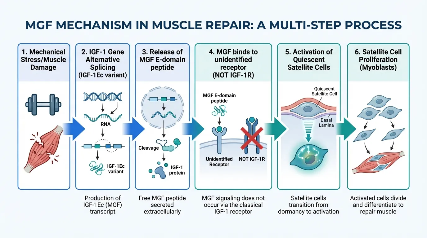 MGF's primary biological role is activating quiescent satellite cells, the resident stem cells of skeletal muscle. This activation stimulates their entry into the cell cycle and proliferation as myoblasts. Importantly, MGF promotes proliferation without premature differentiation, expanding the progenitor cell pool before differentiation signals (from later IGF-1Ea expression) drive myoblast fusion into mature myofibers.