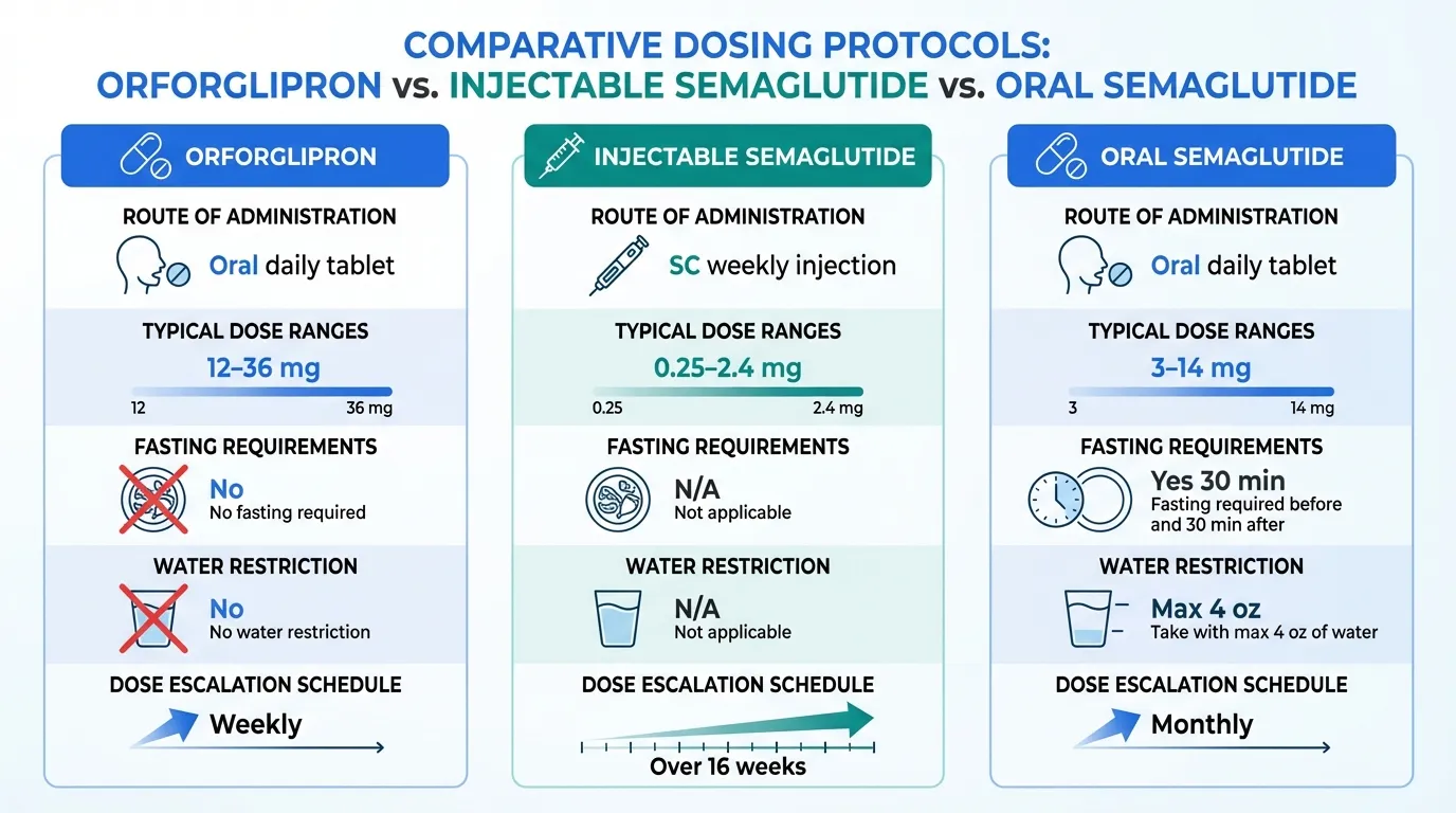 | Dosing Convenience | Oral daily tablet taken without fasting or water restrictions. No injection required. Simple administration that can be taken with food and other medications. | Injectable (Ozempic/Wegovy) requires weekly subcutaneous injection. Oral (Rybelsus) requires fasting, no more than 4 oz water, and 30-minute wait before food or other medications. | Orforglipron |