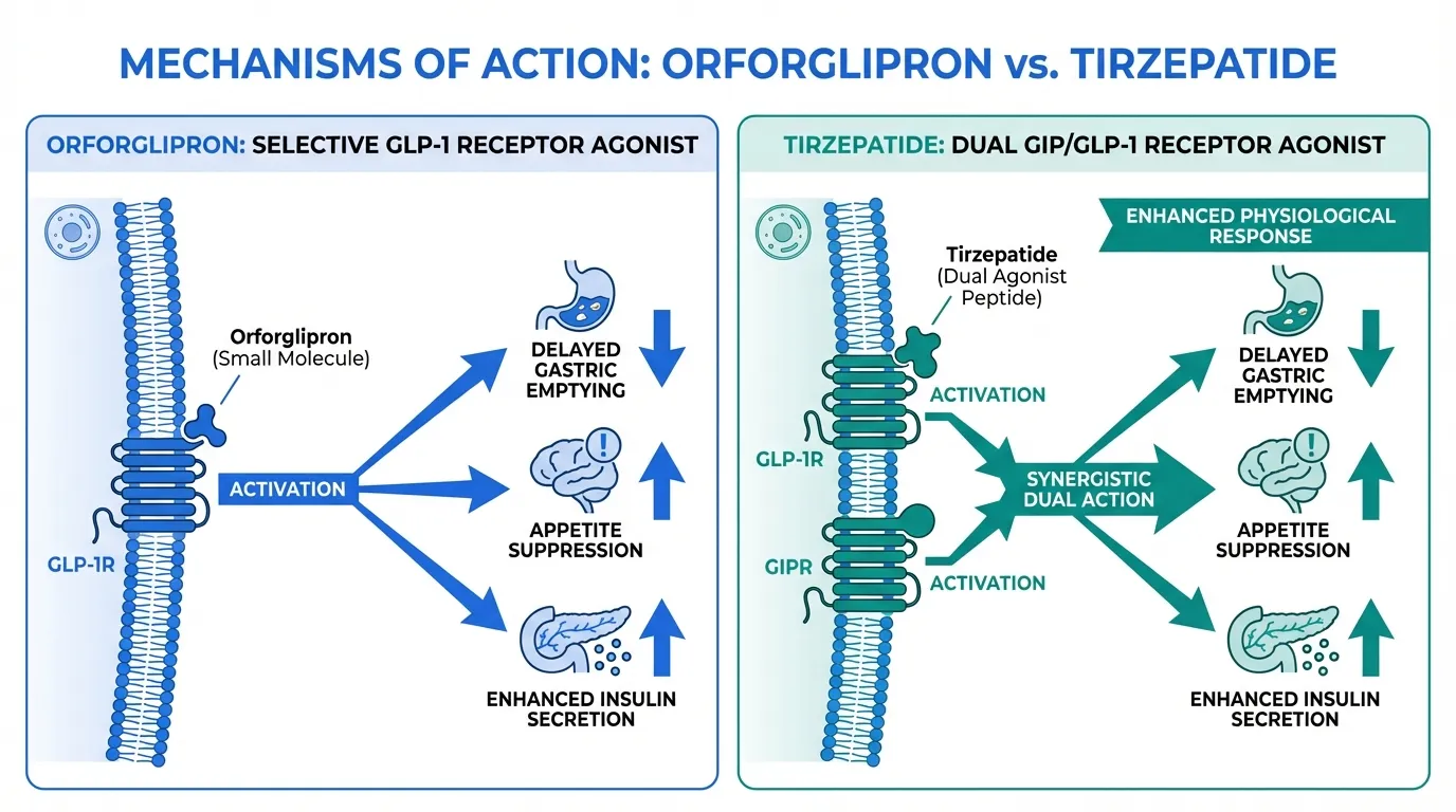 - Mechanism: Tirzepatide has dual GIP/GLP-1 agonism; orforglipron is GLP-1-only