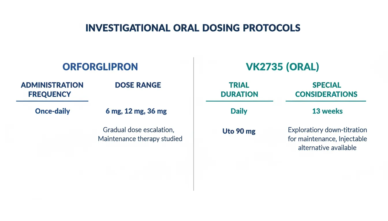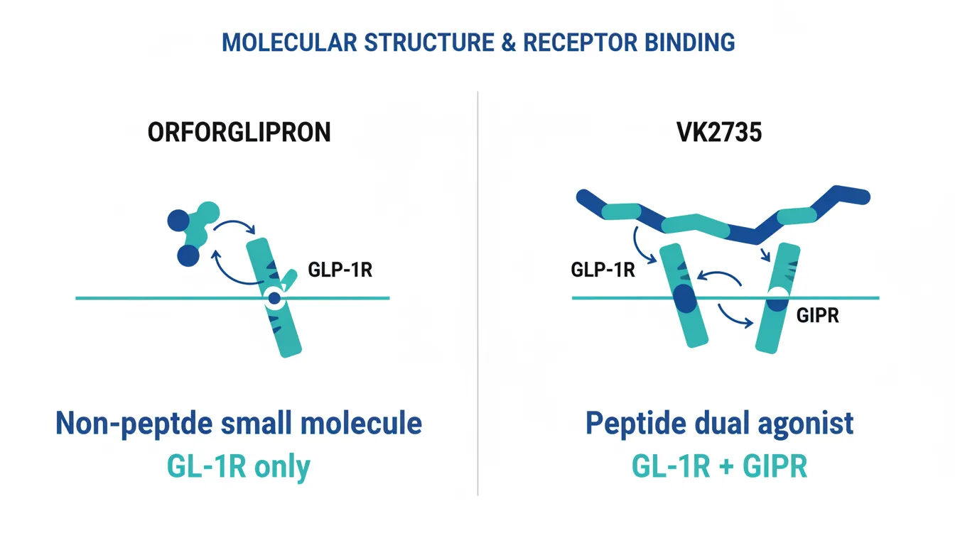 - Receptor targets: Orforglipron activates GLP-1R only. VK2735 activates both GLP-1R and GIPR. The dual mechanism has been validated by tirzepatide's clinical superiority over semaglutide.