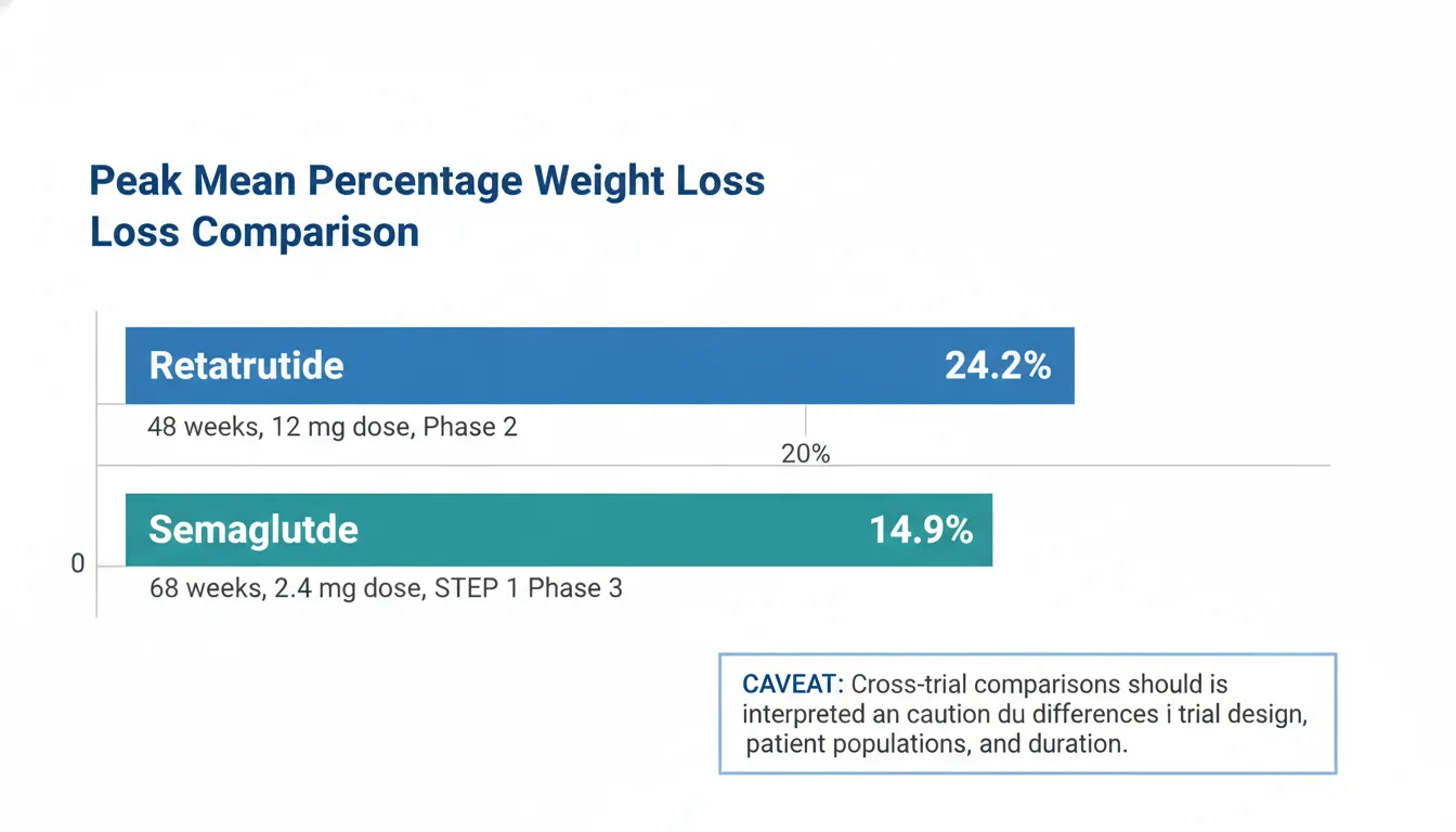 Retatrutide's 24.2% weight loss at 48 weeks appears numerically superior to semaglutide's 14.9% at 68 weeks, but several factors complicate direct comparison: