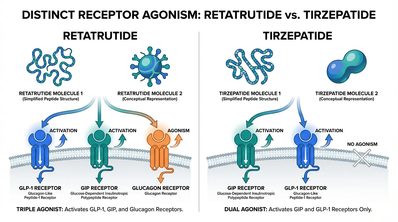 - Receptor pharmacology: Retatrutide is a triple agonist (GIP/GLP-1/glucagon); tirzepatide is a dual agonist (GIP/GLP-1)