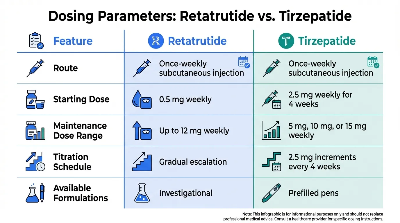 - Regulatory status: Tirzepatide is FDA-approved; retatrutide is investigational