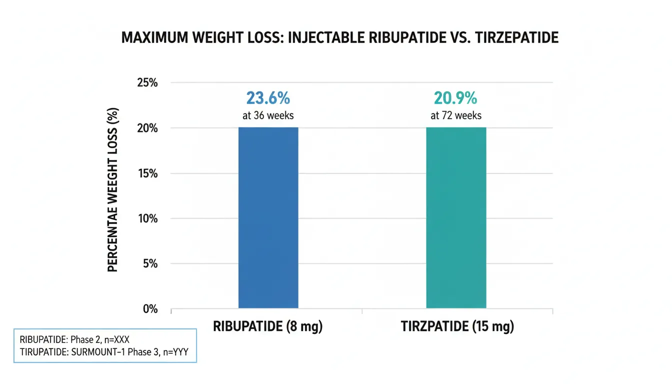 - Weight loss: Ribupatide 23.6% (Phase 2, 36 wk) vs tirzepatide 20.9% (Phase 3, 72 wk)