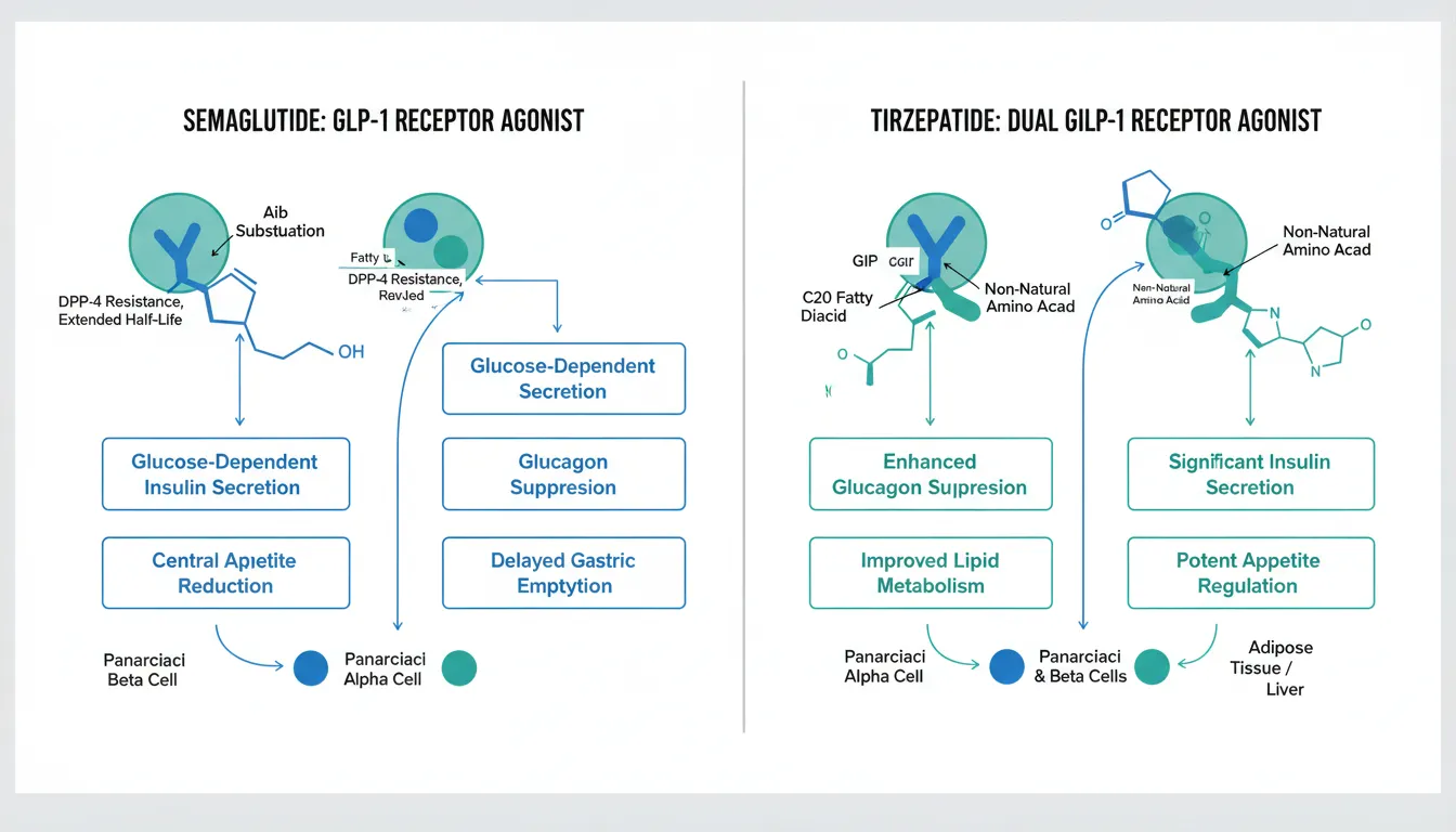 - Receptor pharmacology: Semaglutide is a selective GLP-1 agonist; tirzepatide is a dual GIP/GLP-1 agonist, representing a novel incretin mechanism.