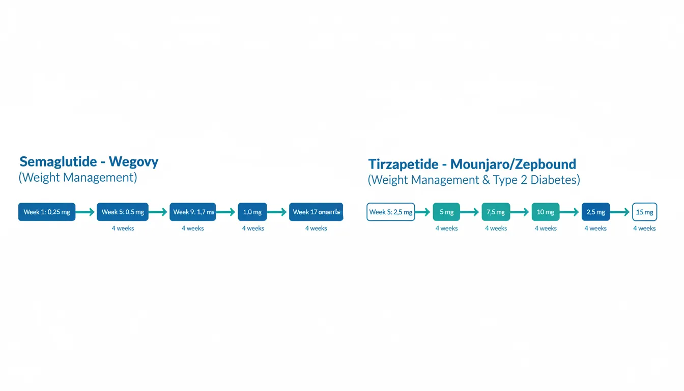 For weight management (Wegovy): A more gradual 16-week escalation from 0.25 mg to the target dose of 2.4 mg weekly (0.25 mg, 0.5 mg, 1.0 mg, 1.7 mg, 2.4 mg at 4-week intervals).