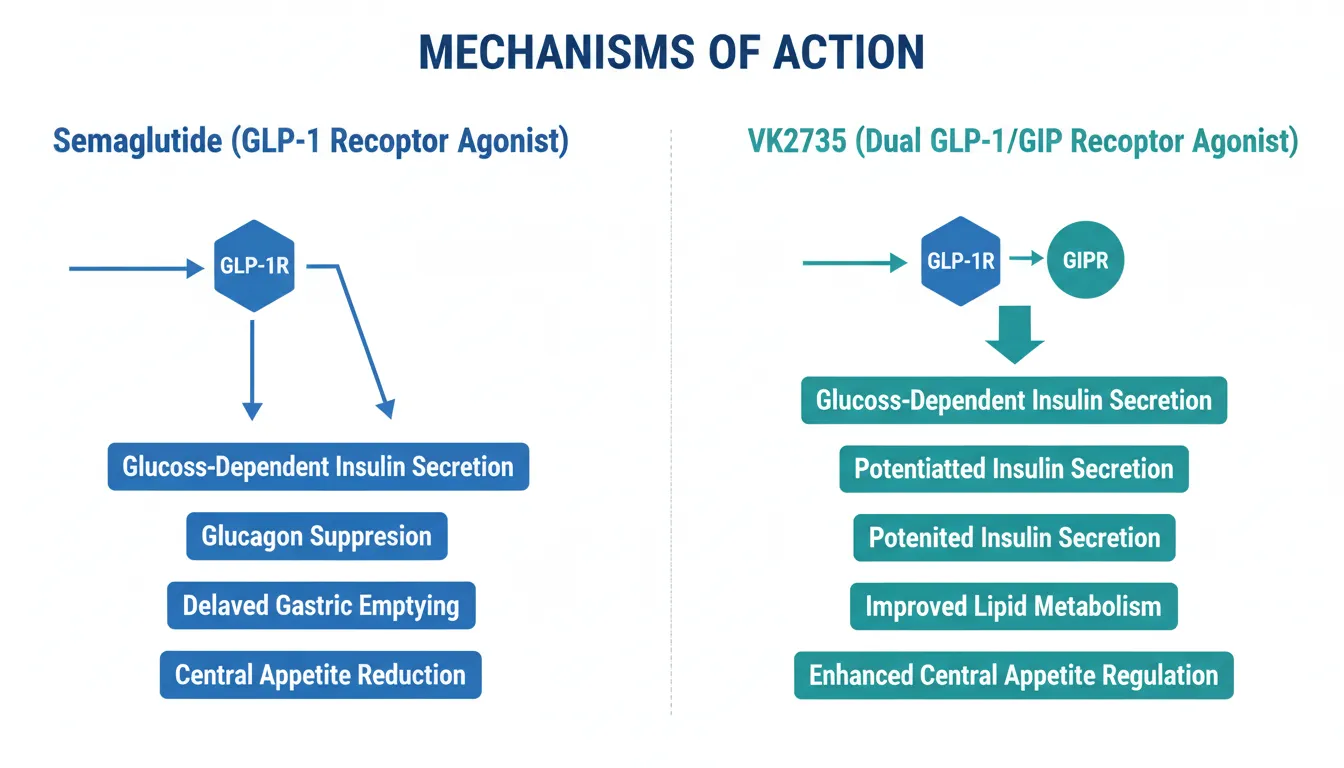 VK2735 is a dual GLP-1 and GIP receptor agonist, activating both incretin pathways simultaneously. This dual mechanism is conceptually similar to tirzepatide (Mounjaro/Zepbound), though VK2735 has a distinct molecular structure. GIP receptor co-activation is believed to potentiate insulin secretion, improve lipid metabolism, and enhance central appetite regulation through mechanisms complementary to GLP-1R signaling.
