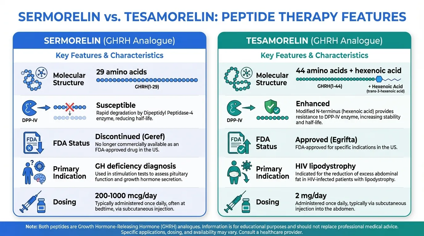 Sermorelin and Tesamorelin are both synthetic analogs of growth hormone-releasing hormone (GHRH) that stimulate endogenous GH production through the pituitary GHRH receptor. Despite sharing this fundamental mechanism, they differ substantially in molecular design, potency, clinical applications, regulatory status, and accessibility. Sermorelin is the shorter, simpler analog (29 amino acids) with historical FDA approval and broad compounding pharmacy availability, while tesamorelin is the larger, stabilized analog (44 amino acids) with current FDA approval for HIV lipodystrophy and emerging metabolic applications.