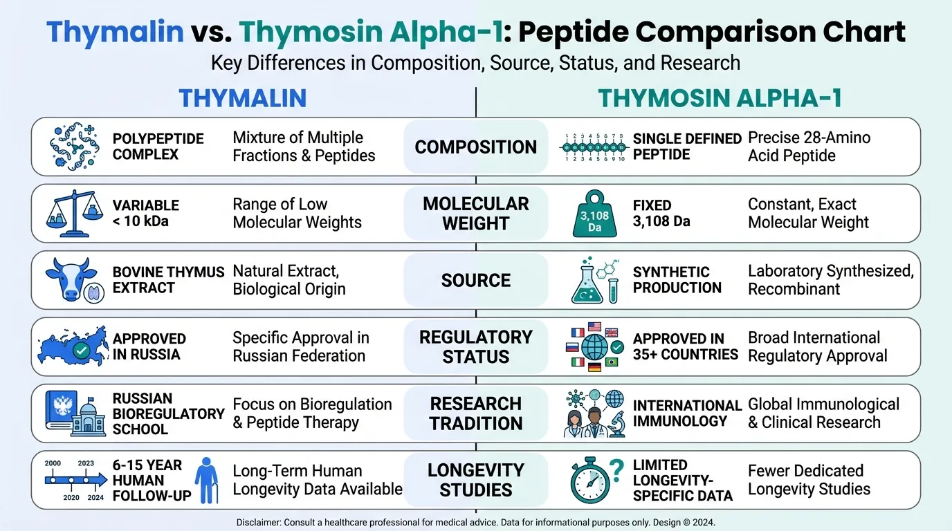 Thymalin vs Thymosin Alpha-1 compared: thymic peptide composition, clinical evidence, longevity research, and dosing differences.