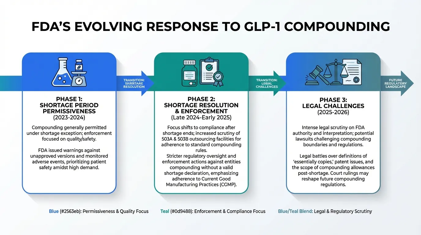 The FDA's approach to GLP-1 compounding has evolved through several stages: