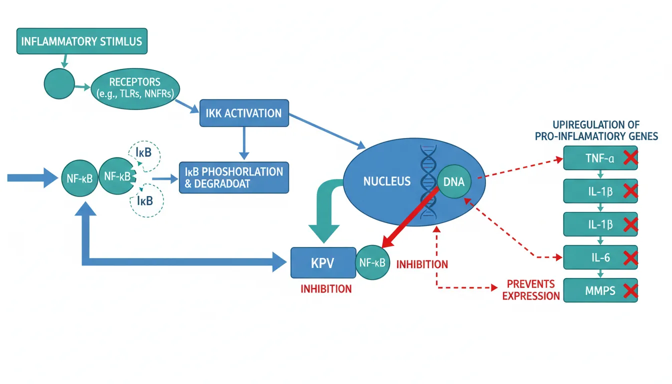 KPV's primary value in this blend is its direct inhibition of NF-kappaB, the transcription factor that serves as a master regulator of inflammatory gene expression 3. In skin specifically, NF-kappaB drives: