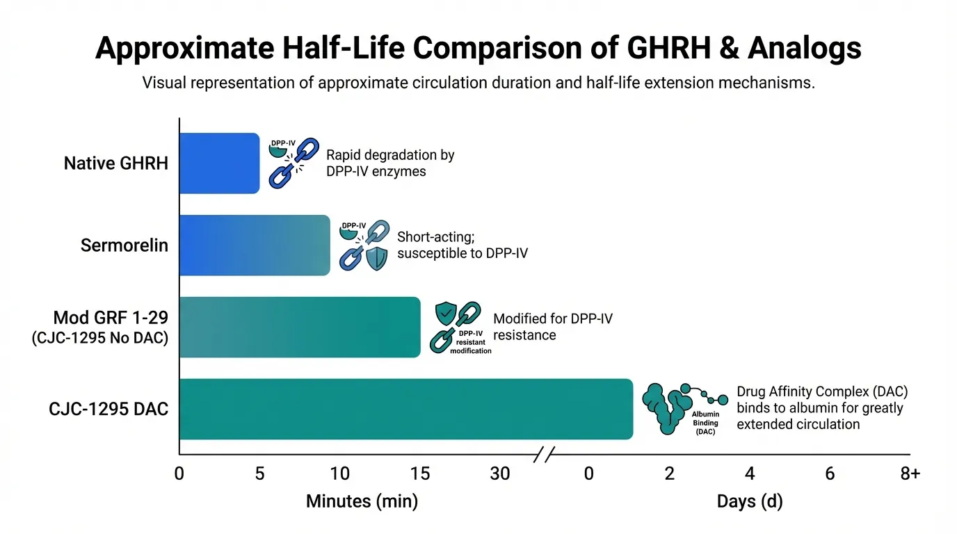 GHRH analogs are synthetic peptides designed to mimic or improve upon the native GHRH molecule. The key challenge with native GHRH is its extremely short half-life in circulation โ it is rapidly degraded by the enzyme dipeptidyl peptidase IV (DPP-IV), which cleaves the N-terminal dipeptide within minutes.