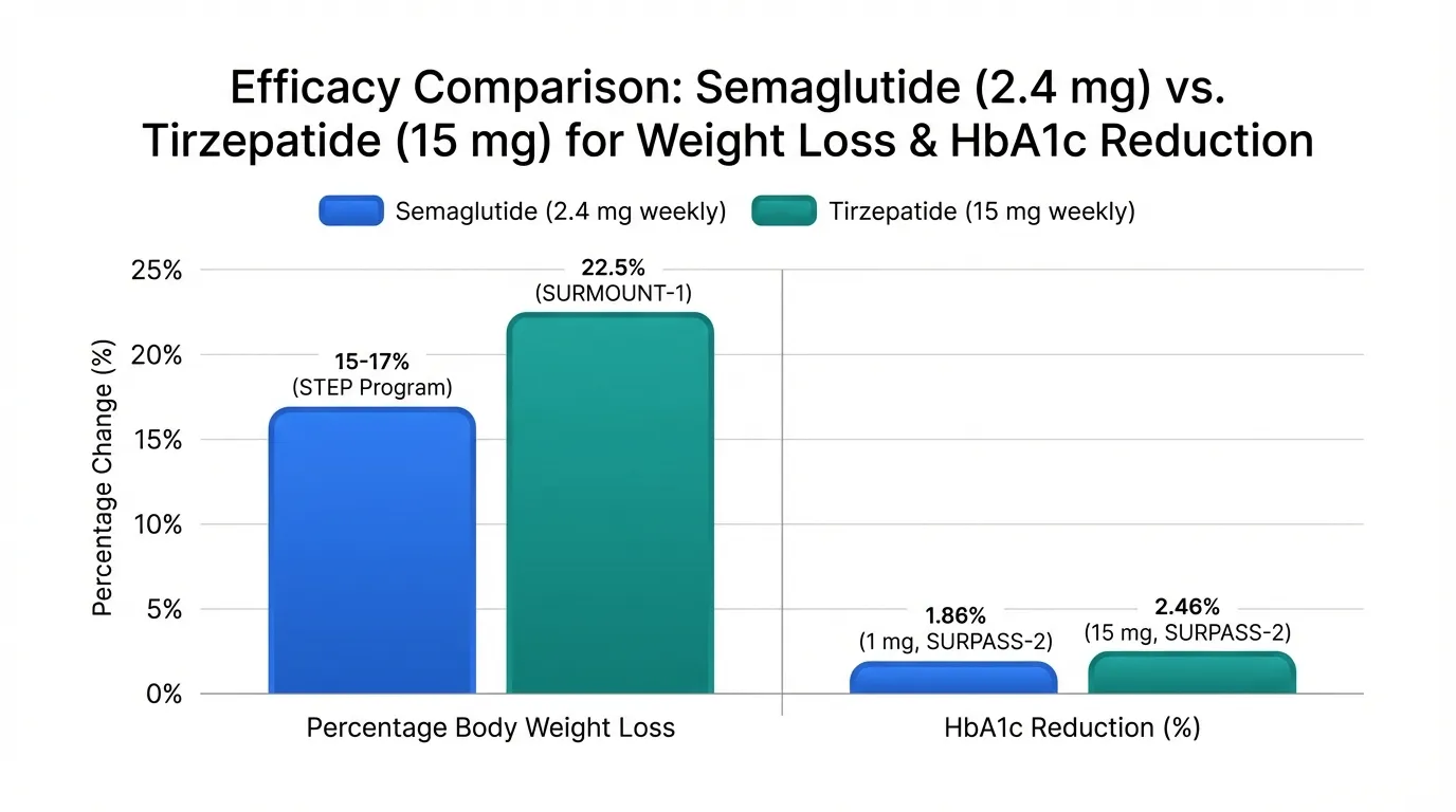 - SURPASS-2 directly compared tirzepatide 15 mg to semaglutide 1 mg and demonstrated superior HbA1c reduction (2.46% vs 1.86%) and weight loss (12.4 kg vs 6.2 kg)