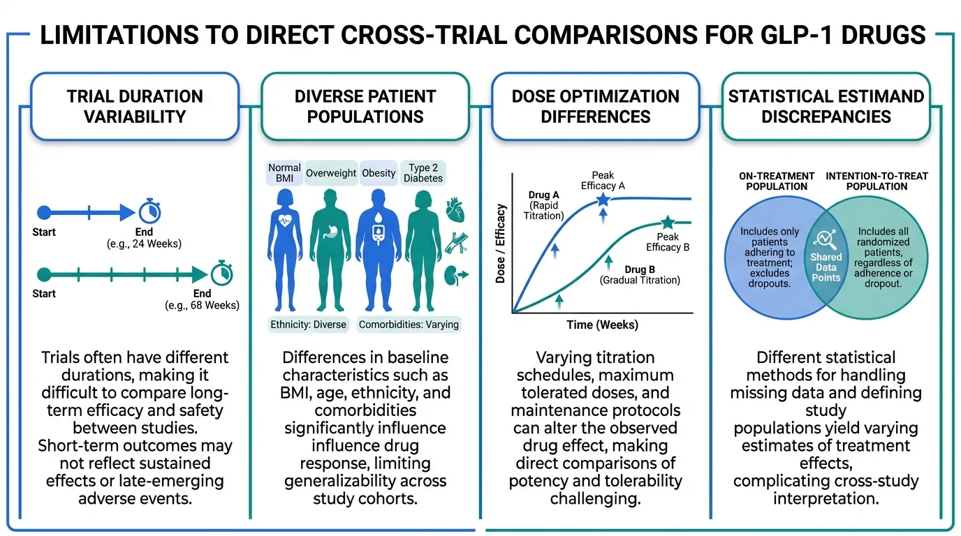 Statistical estimands differ -- Some trials report treatment policy estimand (intention-to-treat), while others report trial product estimand (on-treatment). CagriSema reported both: 20.4% (treatment policy) vs 22.7% (trial product) in REDEFINE 1.