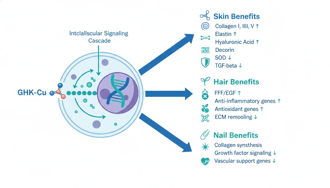 GHK-Cu's relevance to hair, skin, and nails rests on its unprecedented gene expression profile. The 2015 study demonstrating modulation of 4,000+ human genes identified multiple networks directly relevant to these tissues 1: