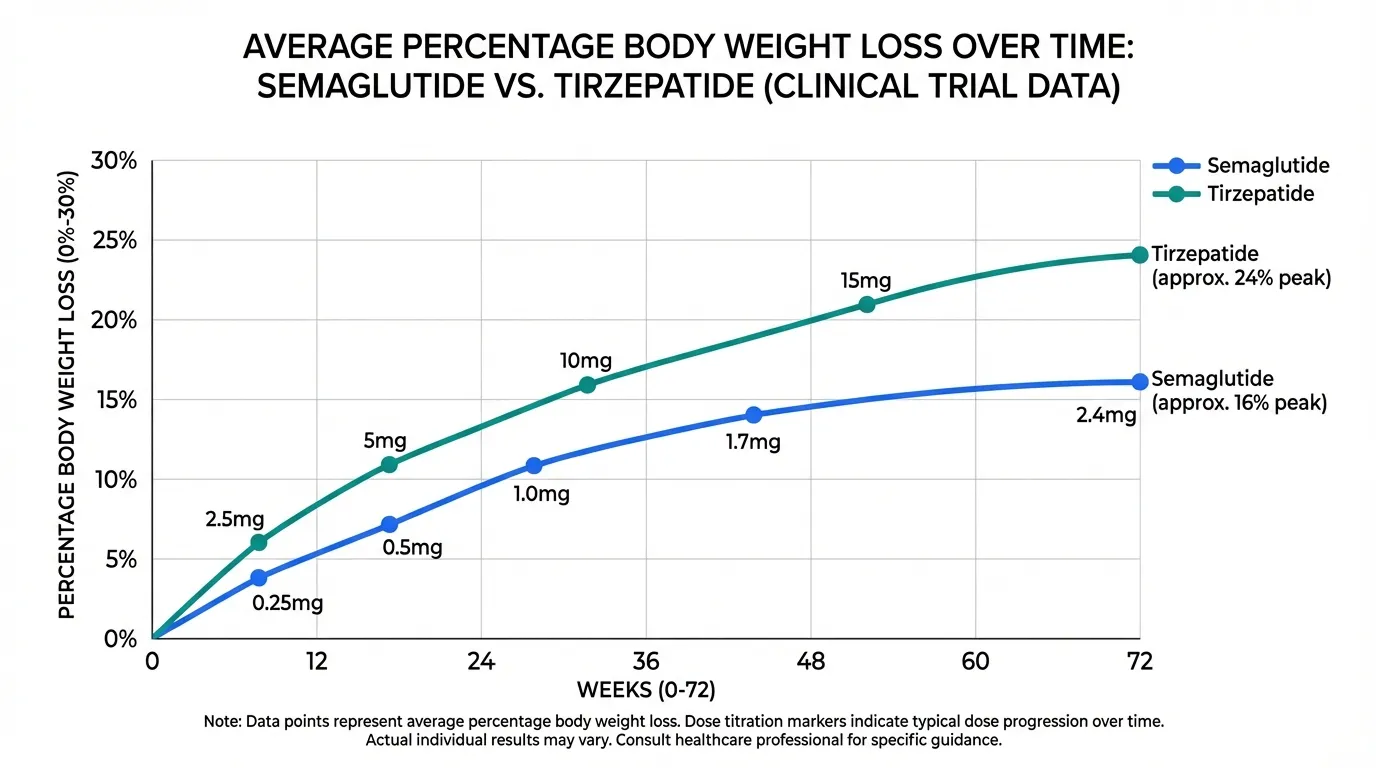 Tirzepatide demonstrated greater maximum weight loss than semaglutide in the head-to-head SURMOUNT trials, though the timeline to plateau was similar.