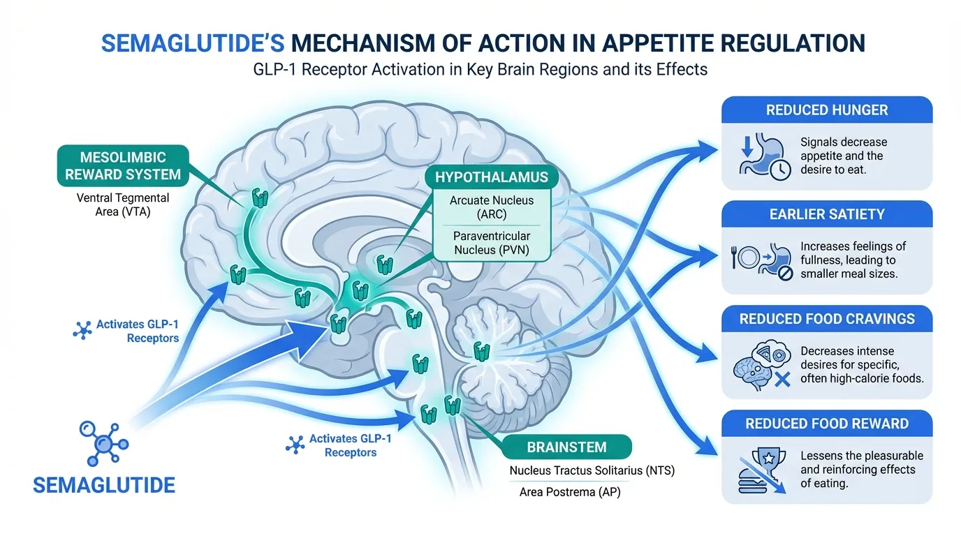 Semaglutide works primarily through central appetite suppression. It activates GLP-1 receptors in brain regions controlling hunger, satiety, and food reward, leading to reduced caloric intake.