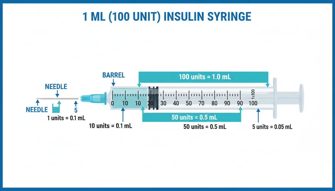A standard 1 mL insulin syringe is marked in "units" from 0 to 100: