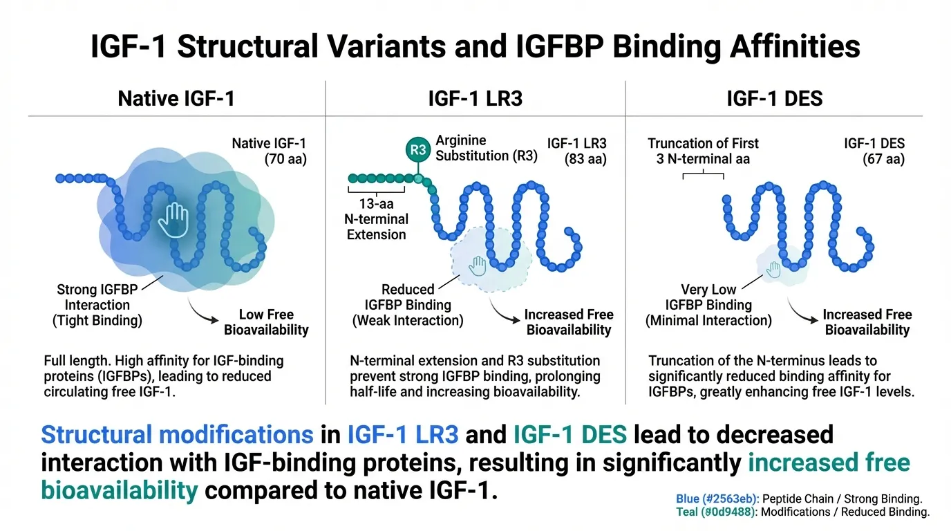 The synthetic IGF-1 variants were designed to manipulate this binding protein relationship. Each variant alters the interaction with IGFBPs in a different way, fundamentally changing the peptide's bioavailability, potency, and tissue distribution.