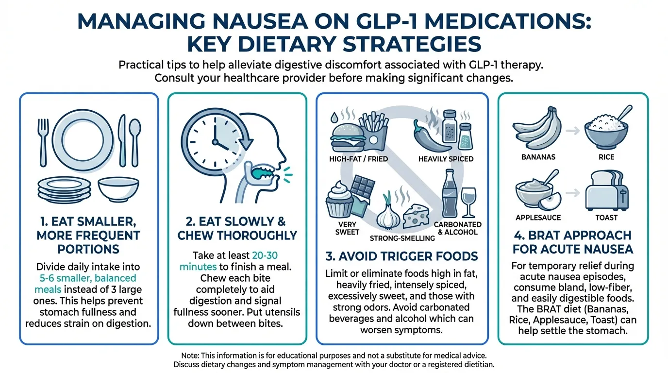 Avoid trigger foods. The most common nausea triggers while on GLP-1 medications include:
