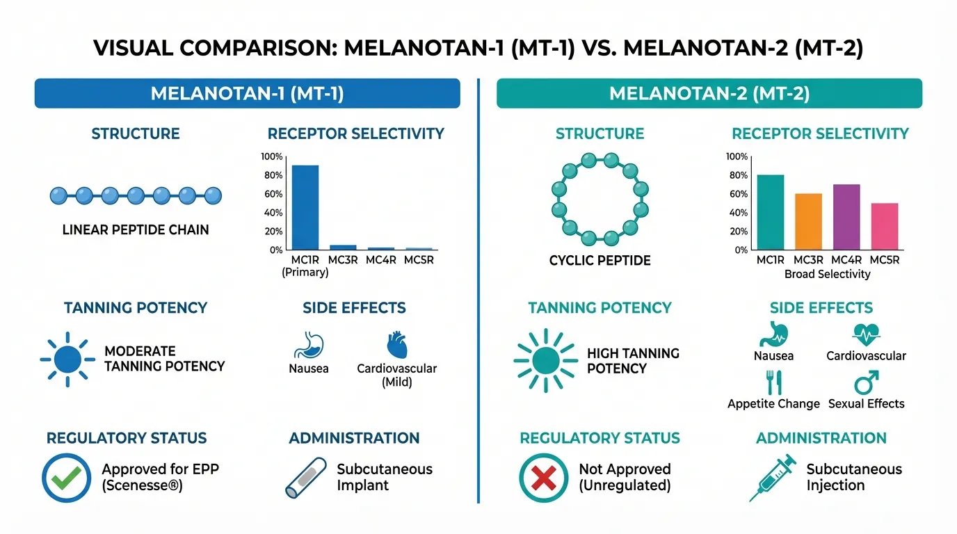 The distinction between Melanotan-1 and Melanotan-2 lies largely in their receptor selectivity, which determines their side effect profiles.