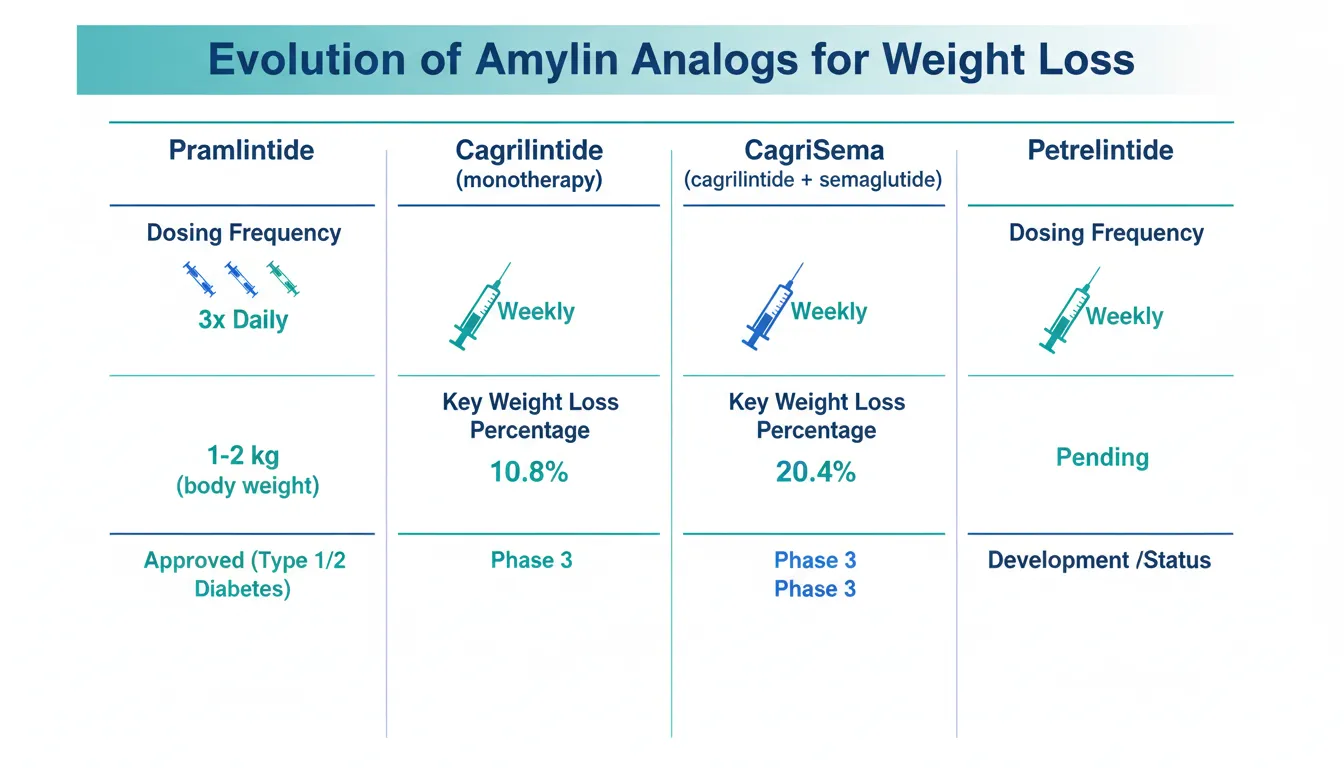 Pramlintide's clinical utility was constrained by its dosing burden, but it established the biological validity of amylin-based weight loss. Its development paved the way for long-acting analogs.