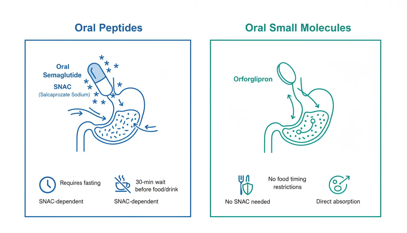 The practical difference is significant. SNAC-dependent oral peptides require patients to take the drug first thing in the morning on an empty stomach and wait 30 minutes before eating or drinking. Small molecules like orforglipron and aleniglipron can be taken at any time, with or without food.
