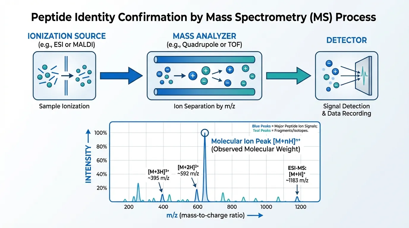 Mass spectrometry confirms the identity of a peptide by measuring its molecular weight. This is the definitive test for verifying that the peptide in a vial is actually the claimed compound.