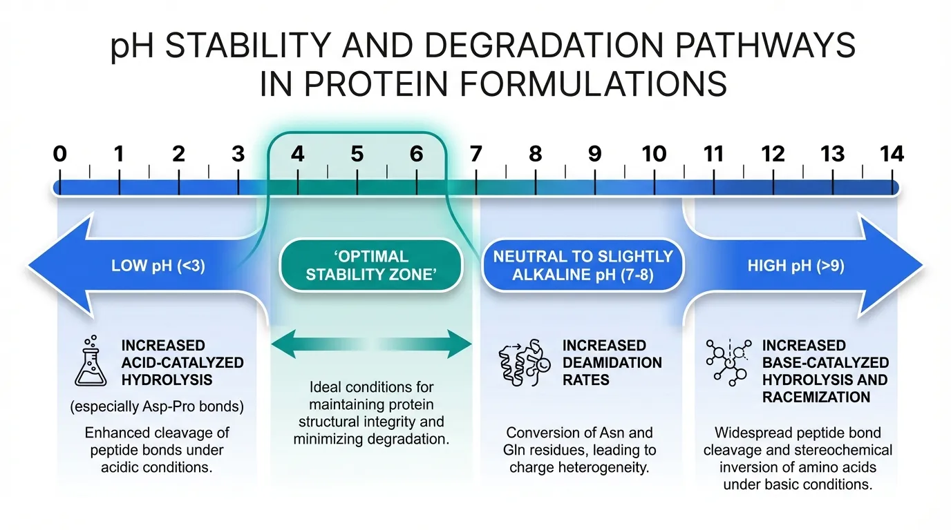 - At low pH (<3): Acid-catalyzed hydrolysis increases, particularly at Asp-Pro bonds