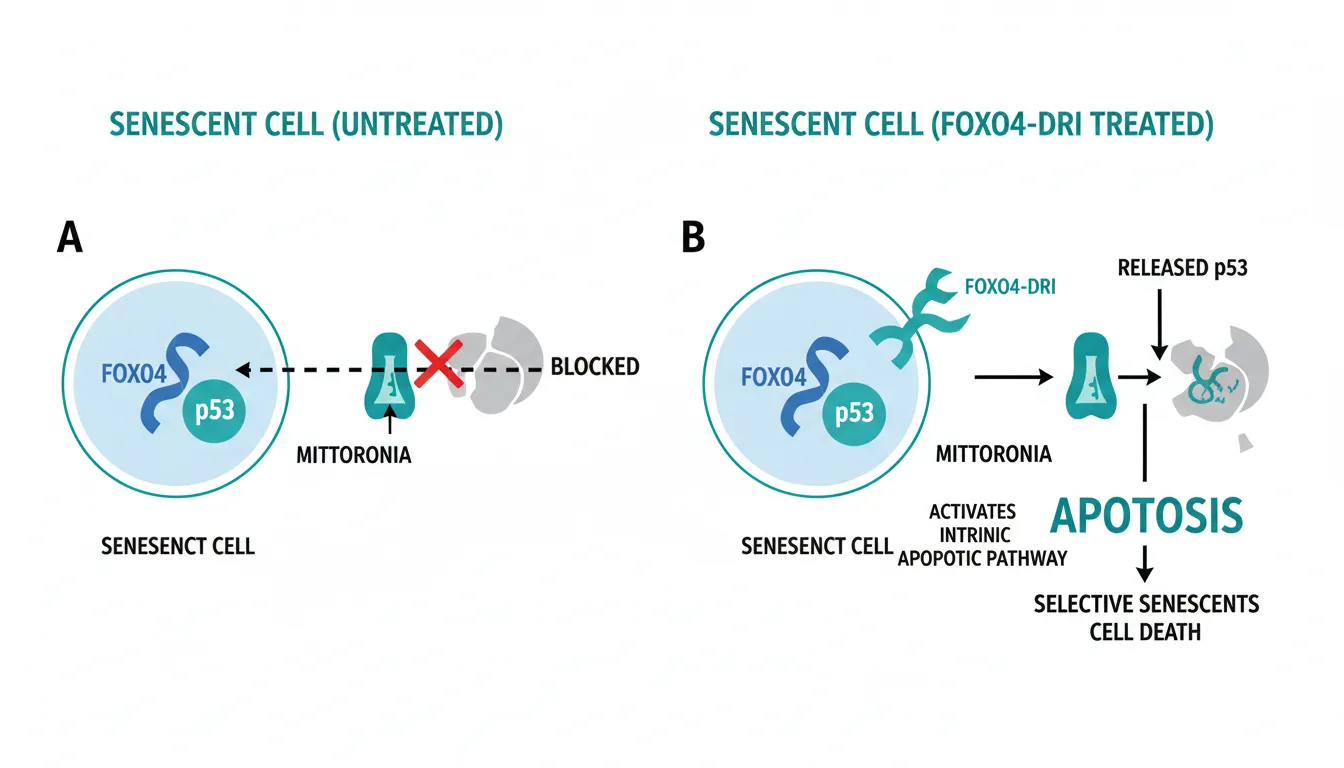 FOXO4-DRI is a D-retro-inverso peptide -- a mirror-image version of a segment of the FOXO4 transcription factor -- designed to selectively eliminate senescent cells. In senescent cells, FOXO4 binds p53 in the nucleus, preventing p53 from triggering apoptosis. FOXO4-DRI competitively disrupts this interaction, releasing p53 to translocate to mitochondria and activate the intrinsic apoptotic pathway.
