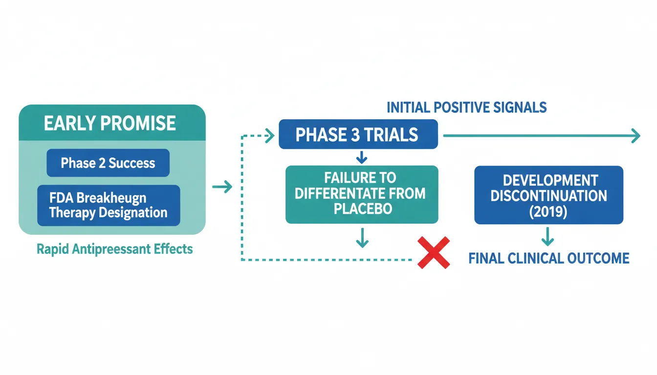 - Phase 3 failure: All three pivotal phase 3 trials (2019) failed to differentiate from placebo on primary endpoints, likely due to high placebo response rates