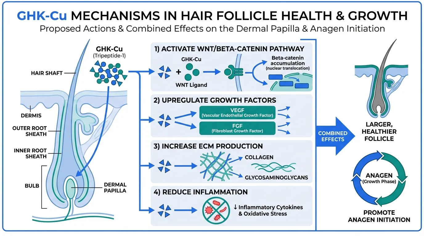 WNT pathway activation. Gene expression studies have shown that GHK-Cu modulates the WNT signaling pathway, the central regulator of hair follicle cycling. Specifically, GHK-Cu has been reported to upregulate WNT ligands and downstream targets including beta-catenin, which promotes anagen initiation and hair follicle neogenesis.