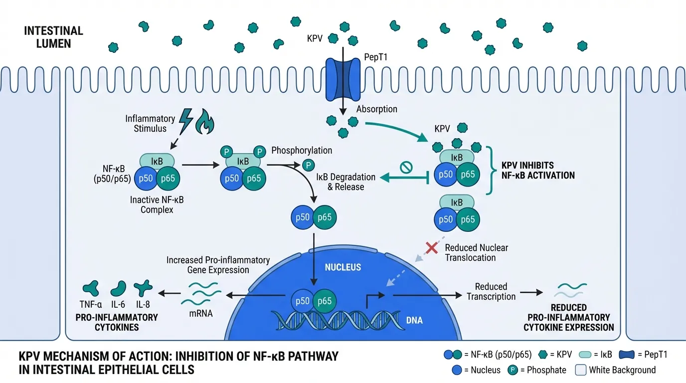 - NF-kappaB inhibition โ KPV has demonstrated dose-dependent suppression of NF-kappaB activation in multiple cell types, including intestinal epithelial cells, macrophages, and keratinocytes
