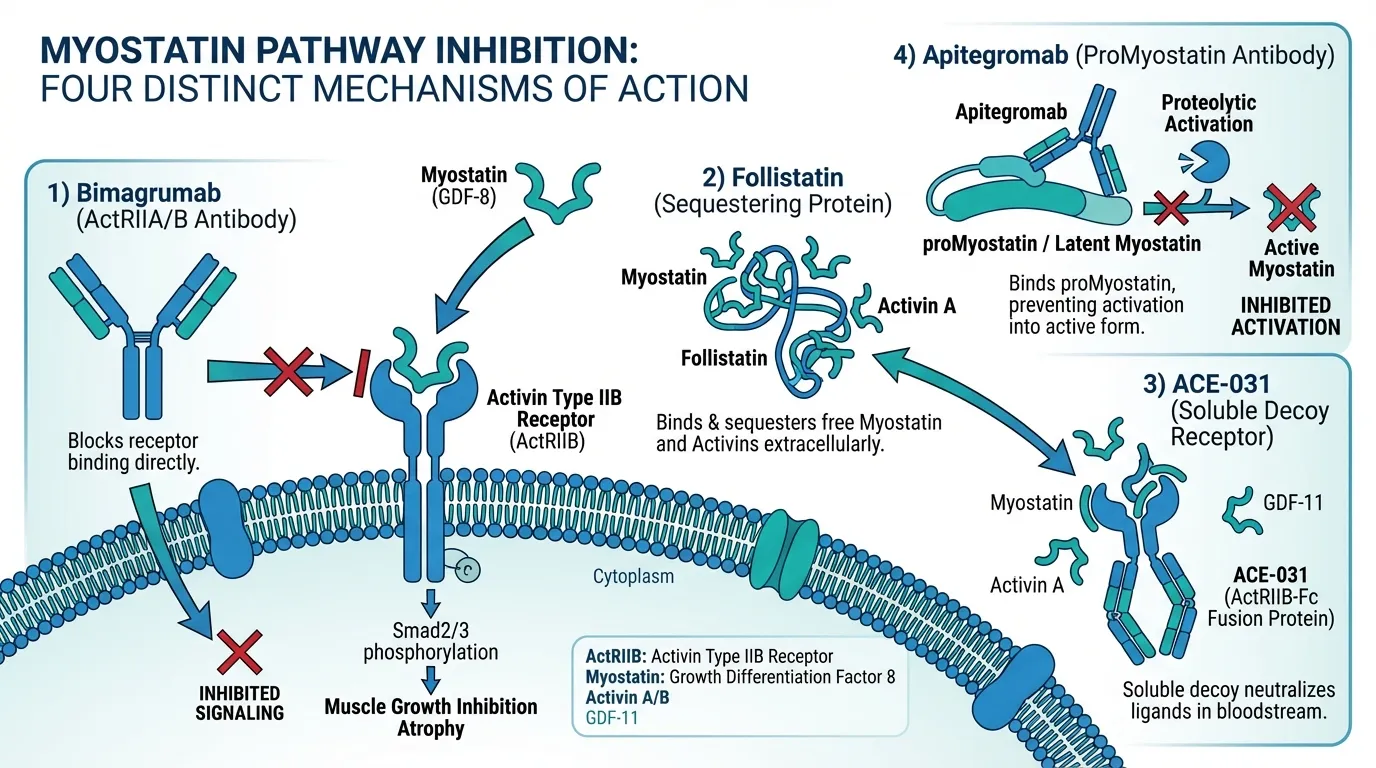 | Decoy receptor | ACE-031 | Myostatin, activins, GDF-11 | Phase 2 (discontinued) | Demonstrated lean mass increase | Vascular side effects, discontinued |
