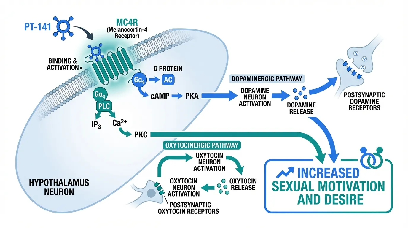 - Mechanism of action โ PT-141 activates MC4R receptors, triggering downstream dopaminergic and oxytocinergic signaling pathways involved in sexual motivation