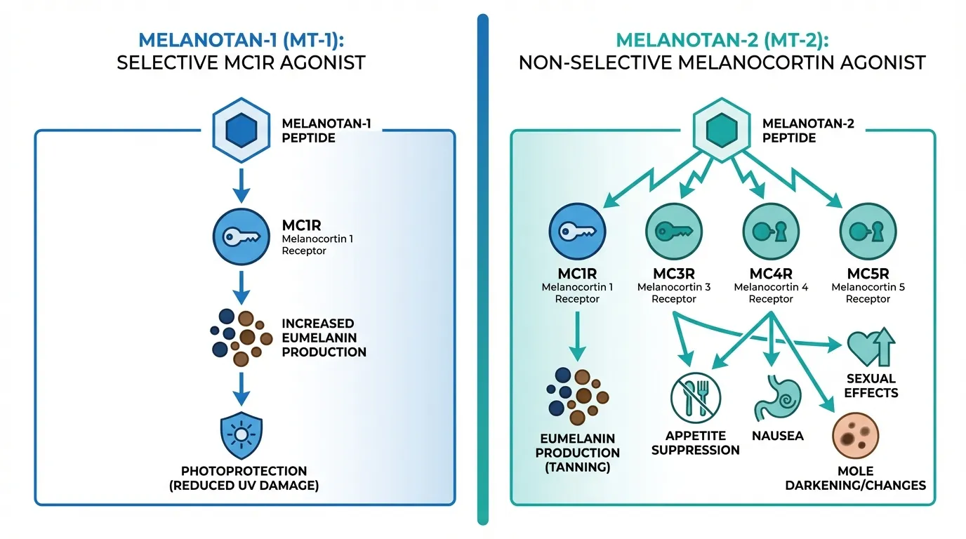 Melanotan-2 is a synthetic cyclic heptapeptide analog of alpha-MSH that activates multiple melanocortin receptors (MC1R, MC3R, MC4R, MC5R). This non-selectivity is responsible for both its tanning effects and its significant side effect profile.