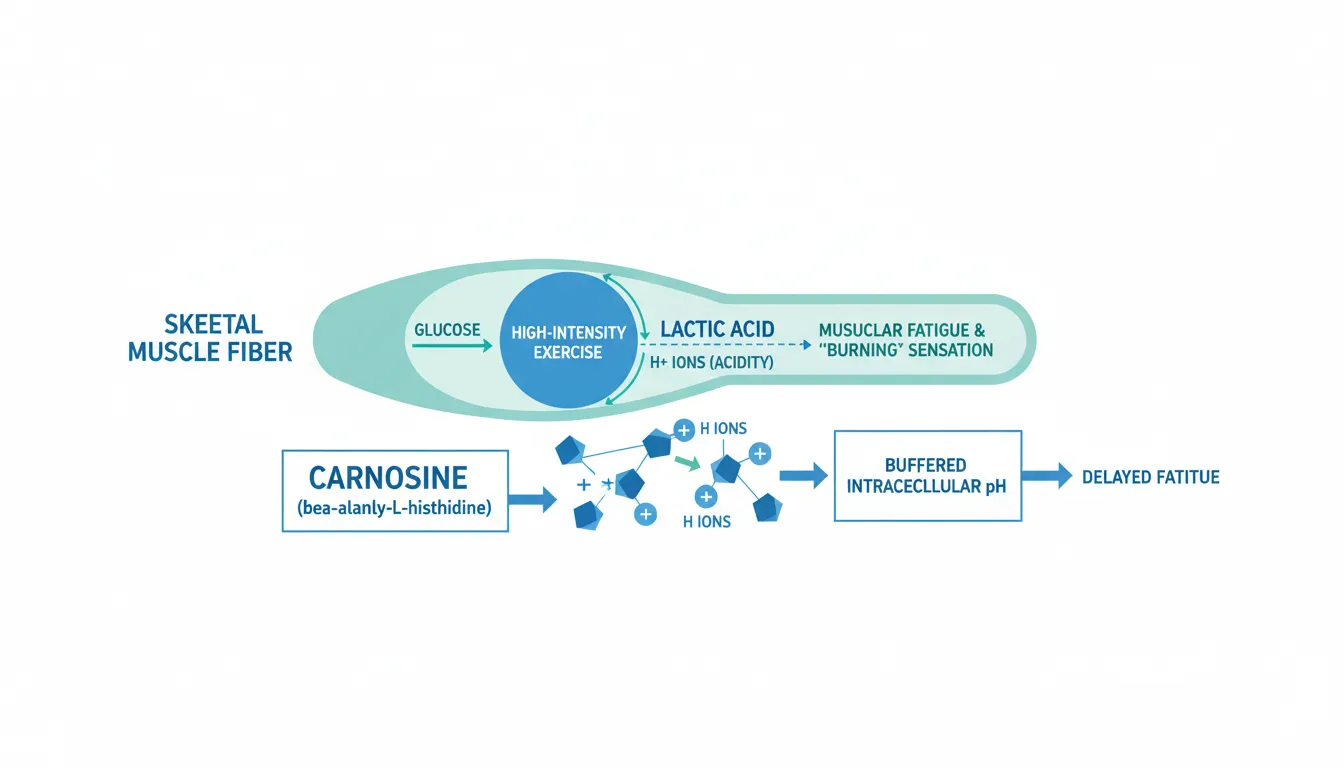 Carnosine (beta-alanyl-L-histidine) is a naturally occurring dipeptide found at high concentrations in skeletal muscle, particularly in fast-twitch (type II) fibers. It serves as the primary intracellular pH buffer during high-intensity exercise, neutralizing hydrogen ions that accumulate from anaerobic metabolism and contribute to the "burning" sensation and muscular fatigue.