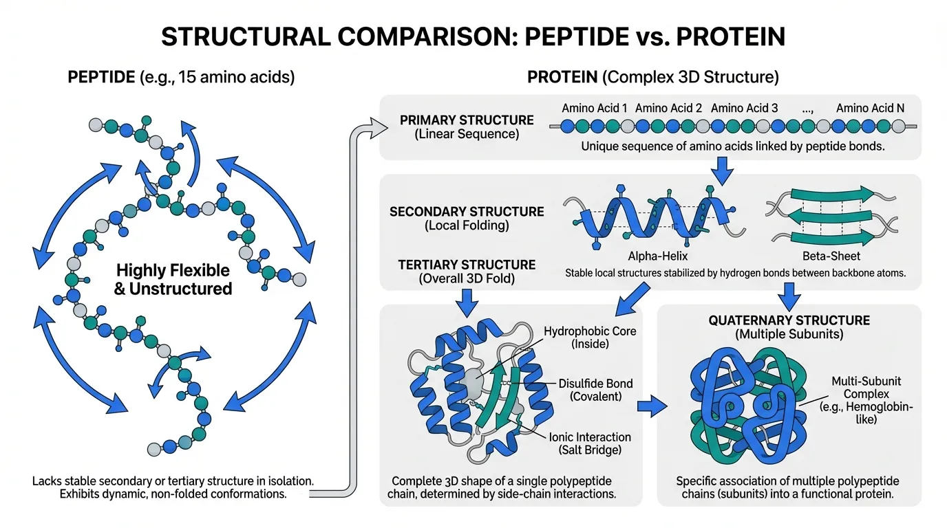 Molecular weight provides another way to think about the distinction. Peptides generally have molecular weights below approximately 5,000-6,000 Daltons (Da), while proteins are larger.