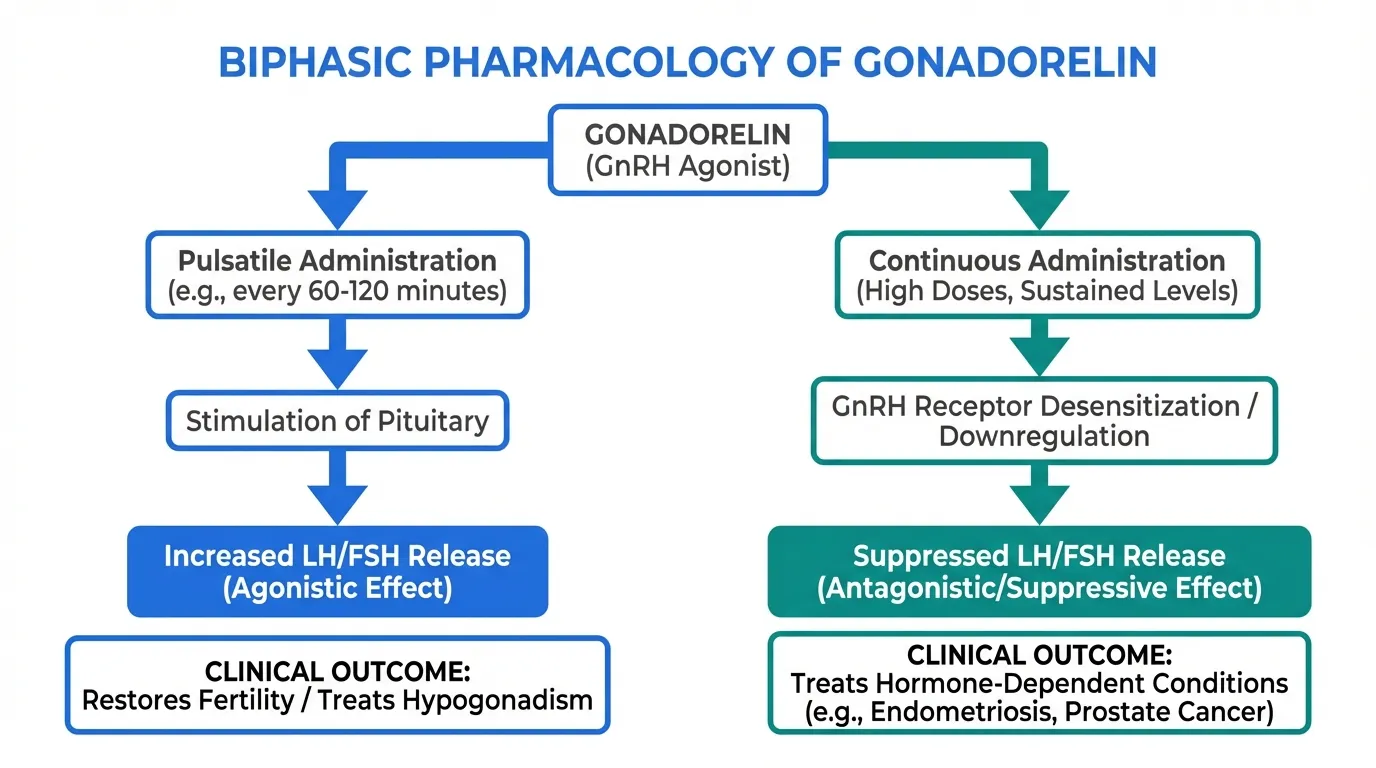 The route and pattern of gonadorelin administration dramatically affect its clinical outcome. Pulsatile administration stimulates gonadotropin release (agonistic), while continuous administration paradoxically suppresses gonadotropins (the same principle exploited by GnRH agonists like triptorelin and leuprolide). This biphasic pharmacology means that improper dosing protocols could produce the opposite of the intended effect.