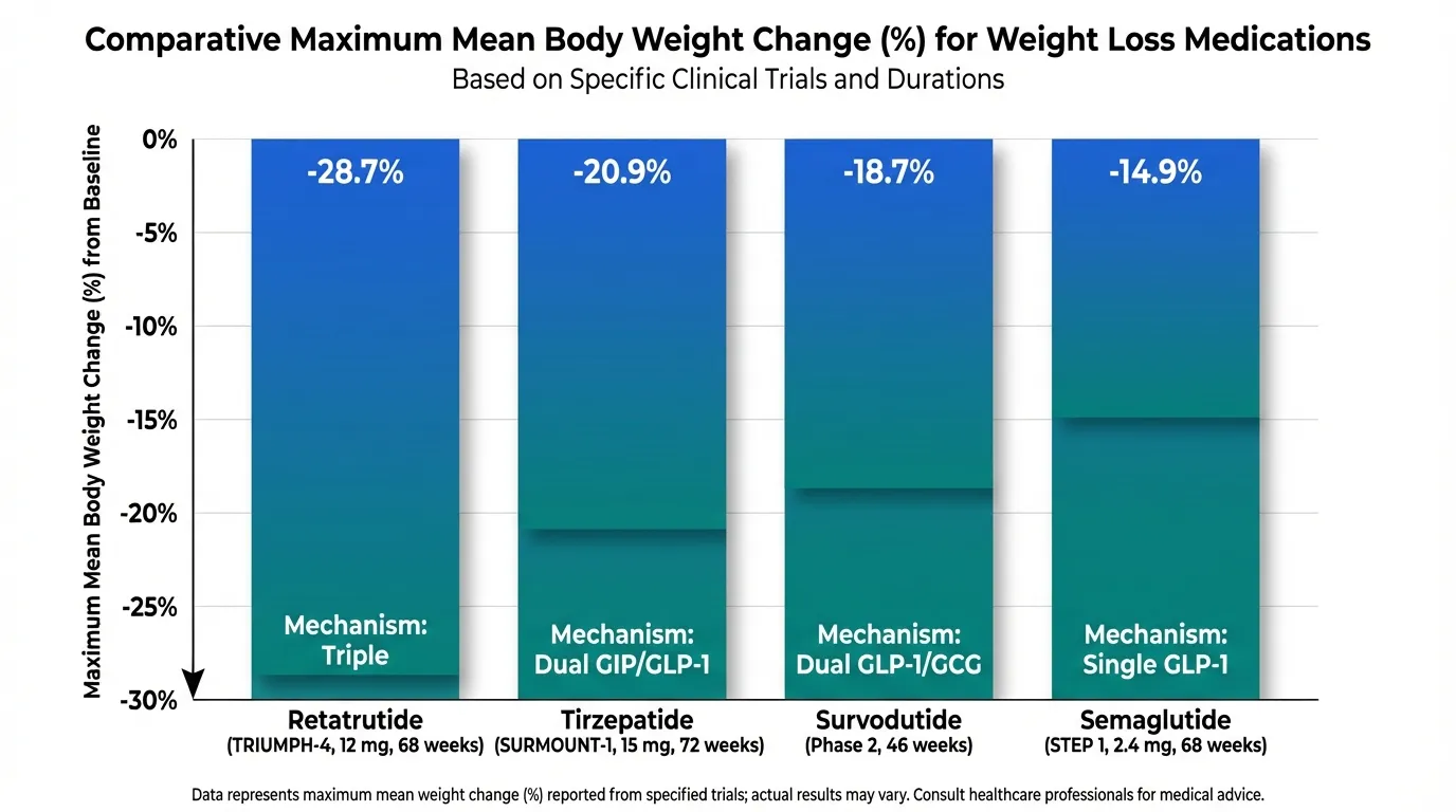 A network meta-analysis published in 2025 comparing these agents confirmed that retatrutide demonstrated the greatest absolute weight reduction among the three, with a mean percentage weight loss significantly higher than both tirzepatide and semaglutide.